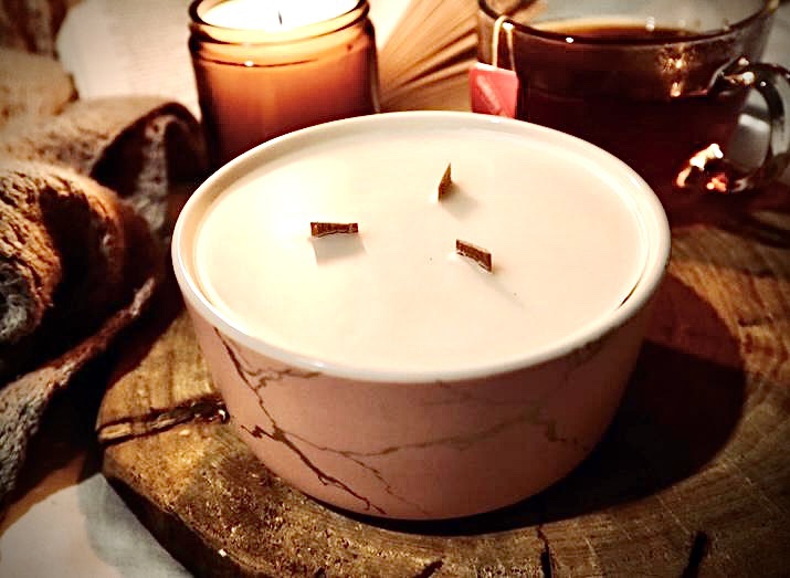 A unique dusty pink bowl with gold marbled effect. Just beautiful. With 3 wooden wicks