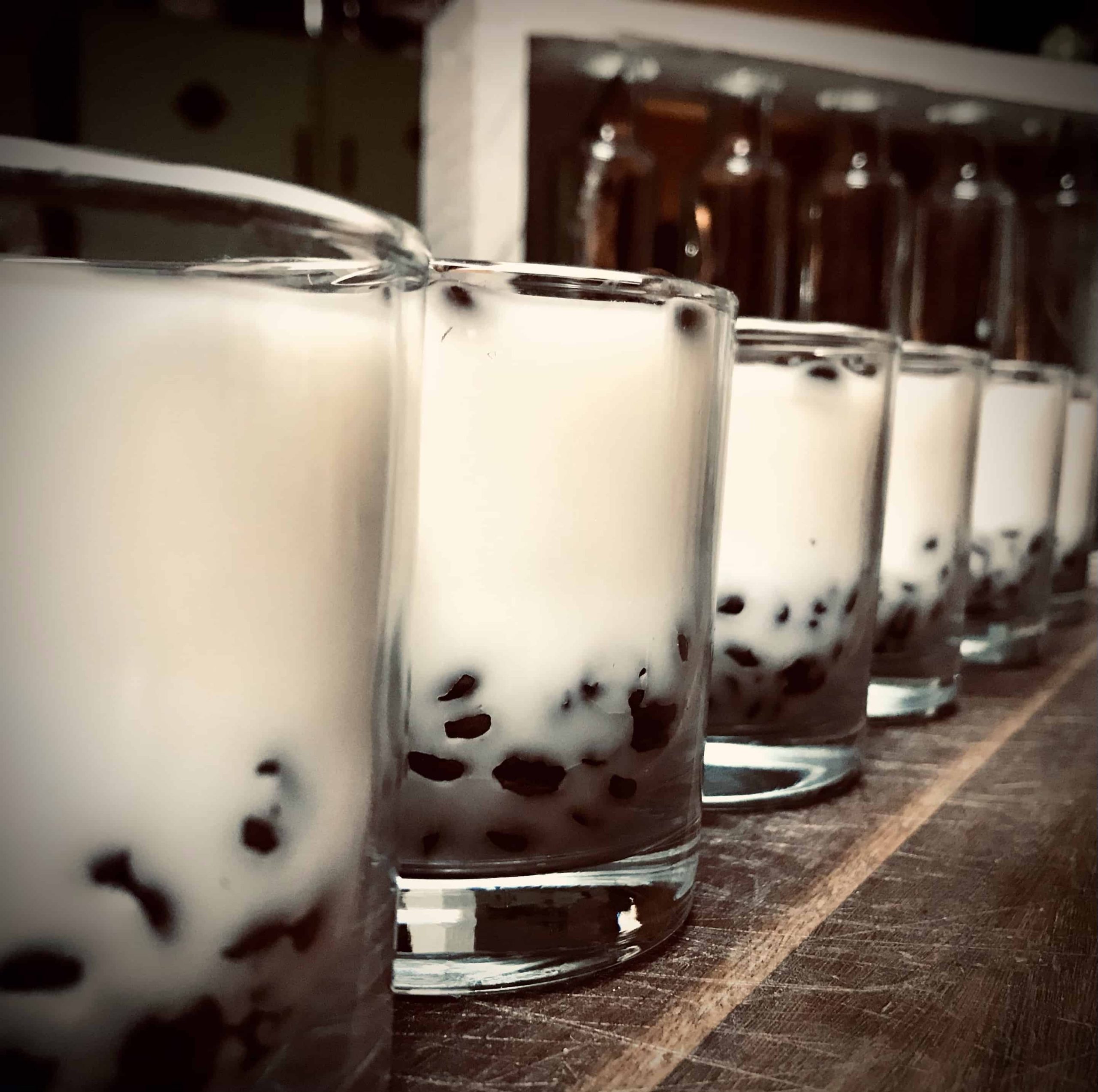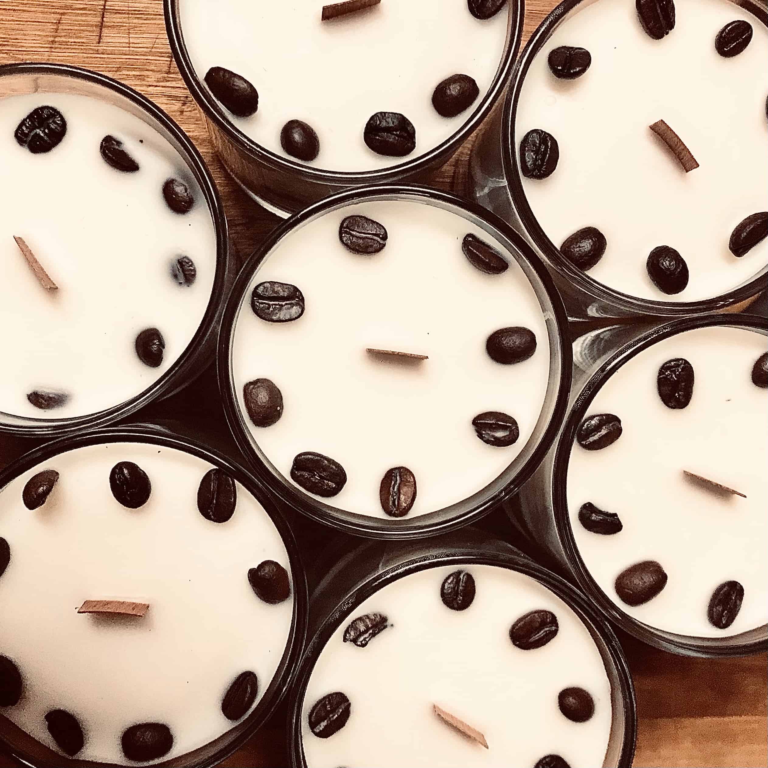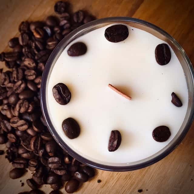 Rich aroma of roasted coffee beans & slight warmth of vanilla; embedded roasted coffee beans. Glass container, wooden wick